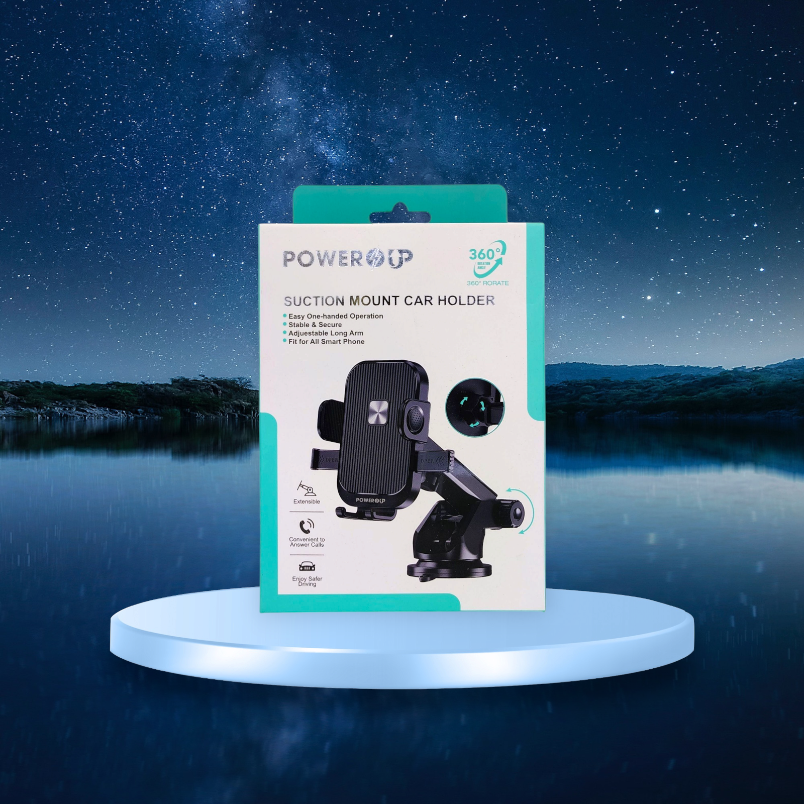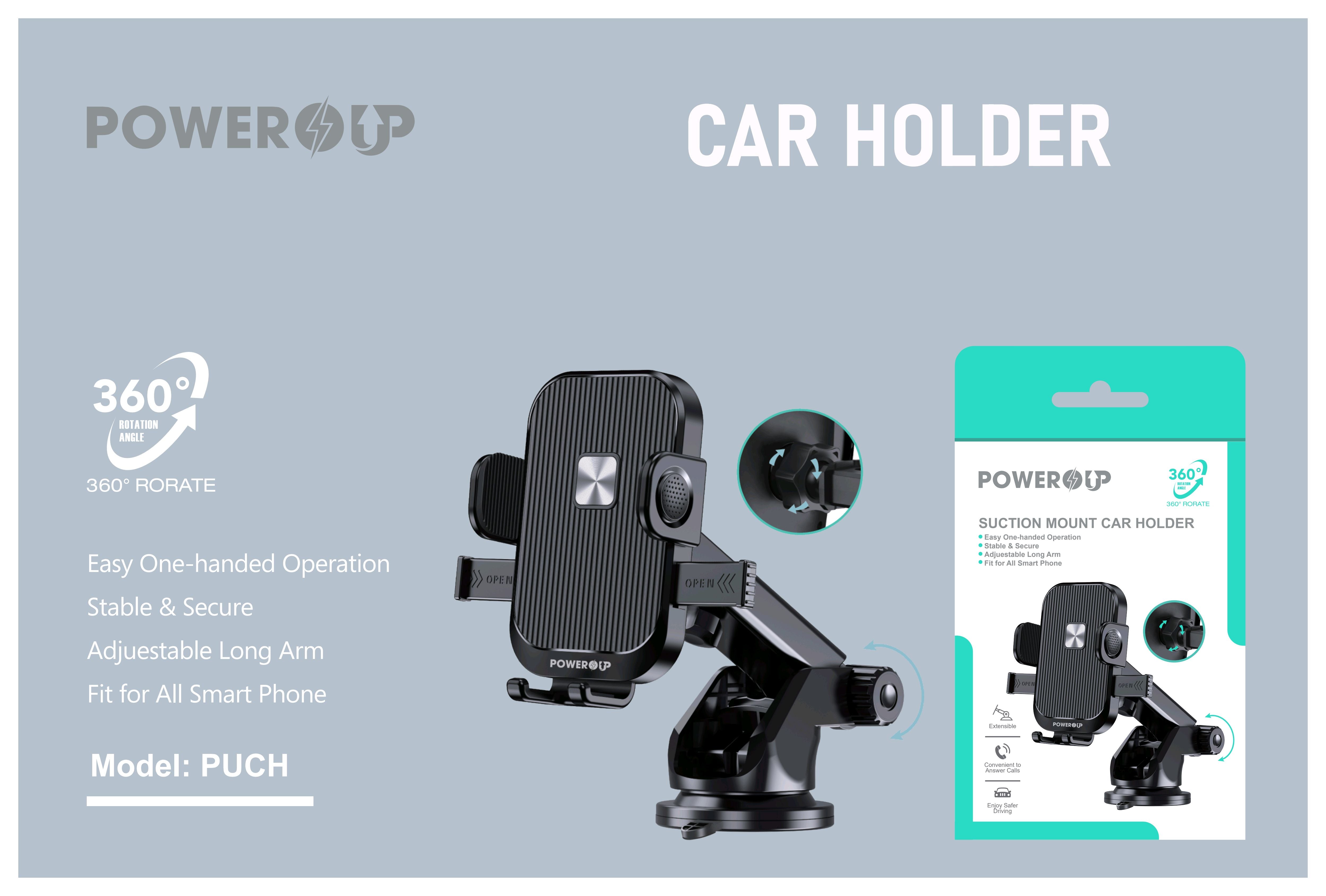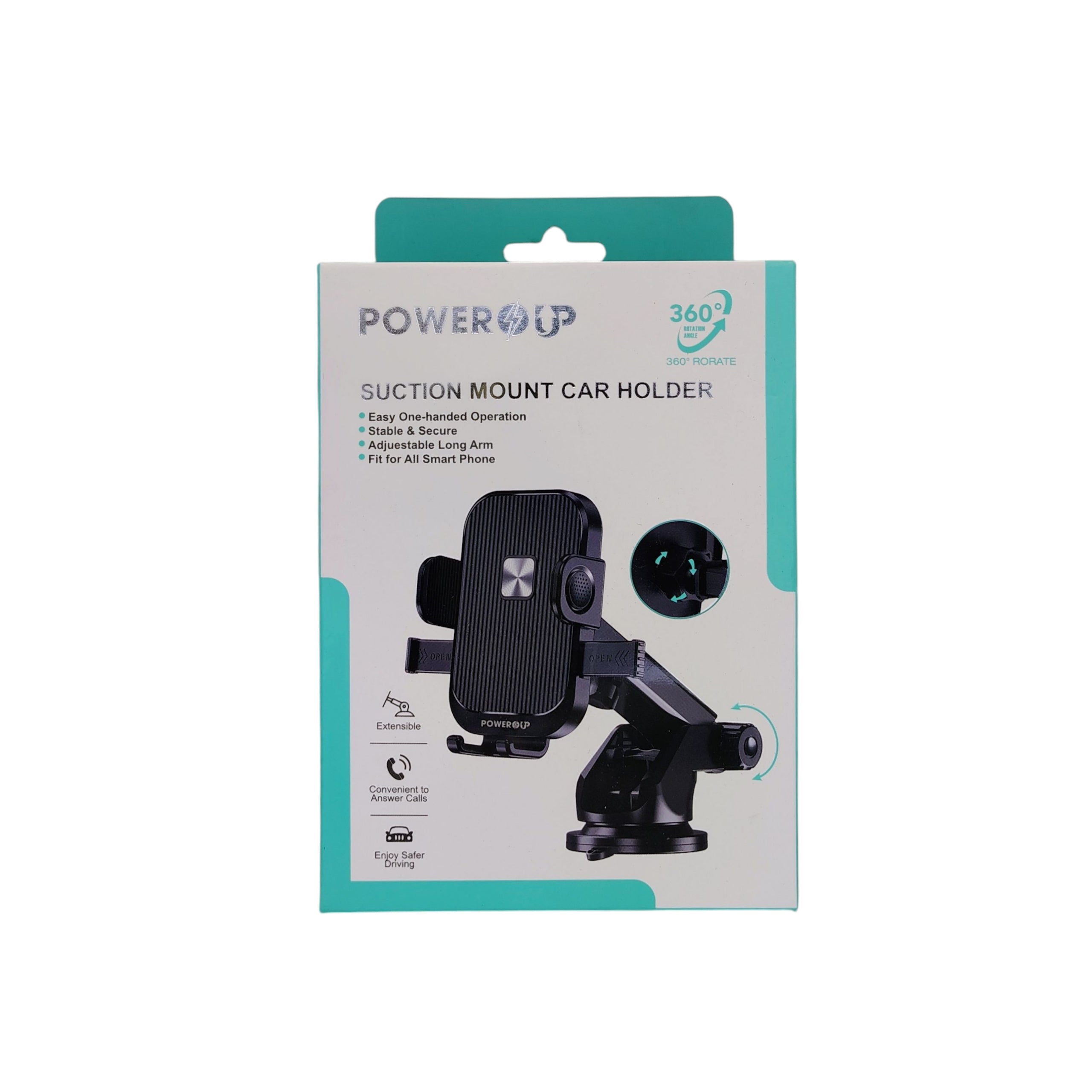 PowerUp Suction Mount Car Holder With Adjustable Arm For Easy One Handed Operation, Stable Secure And Fit For All Smart Phones