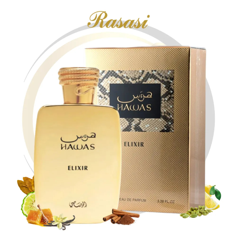 Hawas Elixir by Rasasi is a unisex EDP spray for men with a sweet, aromatic, and fresh profile, featuring an opening of mint and lavender, a heart of vanilla and benzoin, and a base of honey, tonka bean, and tobacco. It is a long-lasting, potent fragrance often compared to the original Lalique Elixir. The scent is known for its confident, sophisticated, and warm character, making it suitable for cooler weather or evening wear.